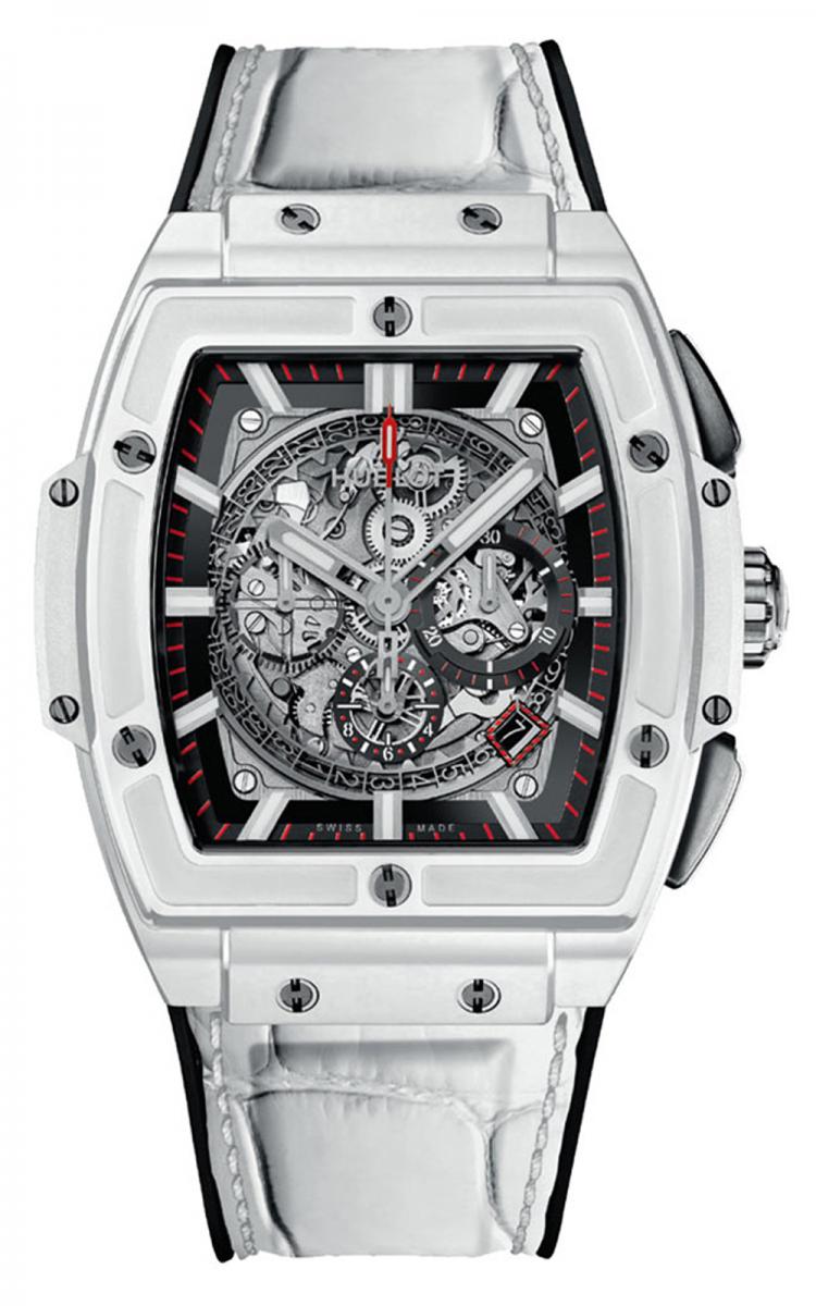 Model Number: 665.OE.2080.RW.1204  Collection : Spirit Of Big Bang  Item Shape : Cushion  Clasp Type : Buckle  Caliber: HUB1710  Functions: Hours, Minutes, Seconds, Date  Case material: Satin-finished and Polished 18K King Gold  Case diameter: 39 mm Bezel material: Polished 18K King Gold Set with 50 Diamonds  Bezel function: Fixed  Hour Markers : Index  Band Material : Structured Lined Rubber  Band Colour : White  Dial colour : Mat White  Movement : Automatic  Water Resistant: 100 m Crystal : Scratch Resistant Sapphire  Watch Label : Swiss Made  Power reserve : 50 hour
